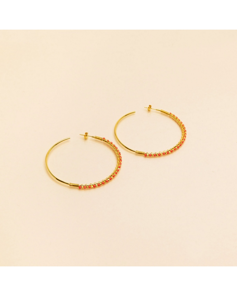 Les créoles Jaipur, un anneau en base laiton doré à l’or fin 18 carats 1 micron, sur lequel s’enroulent des petits écrous en base laiton doré à l’or fin 18 carats 1 micron et des perles de pierres.